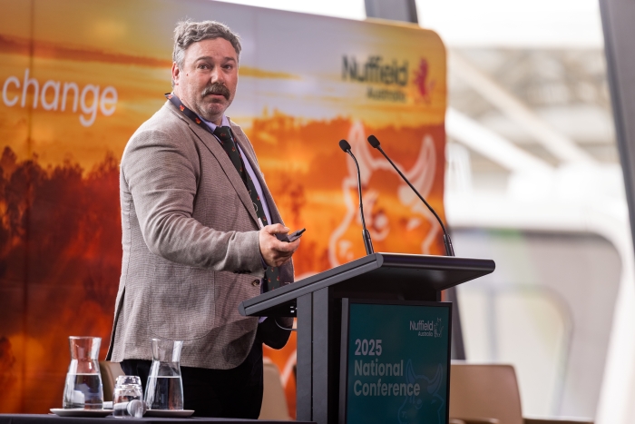 2013 Nuffield Scholar Lachie Seears addresses the 2025 Nuffield Australia National Conference held in Adelaide in September. Photo: Nuffield/Frankie The Creative