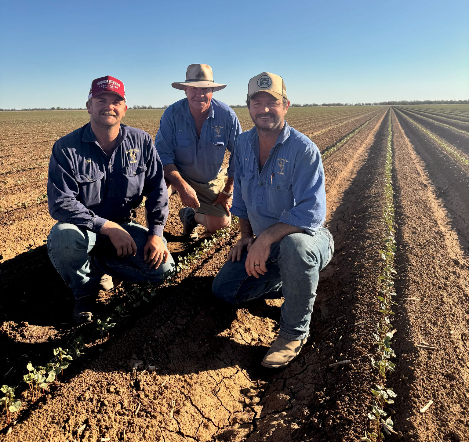 Tom, Kim and Matt Russ in a field of October-planted Sicot 746B3F cotton. Picture supplied